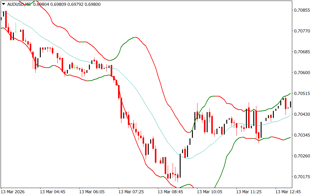 The Bollinger Bands Bicolor Indicator appears directly on the main MT4 chart window and shows different market conditions that traders can either trade or avoid.