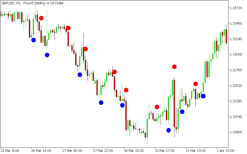 - Buy signals: When blue circles appear and price shows bullish continuation, traders may consider long positions or exit shorts
