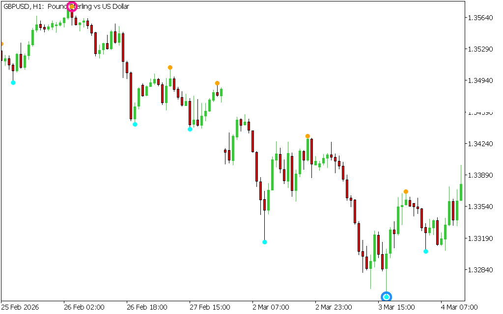 - Clear Visual Signals: Green dots indicate bullish reversals, red dots indicate bearish reversals.