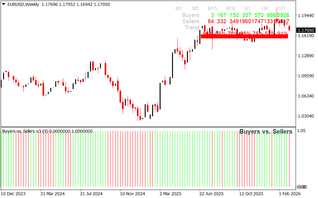 The Buyers vs Sellers Indicator is a MetaTrader 4 (MT4) tool designed to help traders identify trend-reversal opportunities by analyzing the balance between buying and selling pressure. It’s particularly useful for daily scalpers and intraday traders.