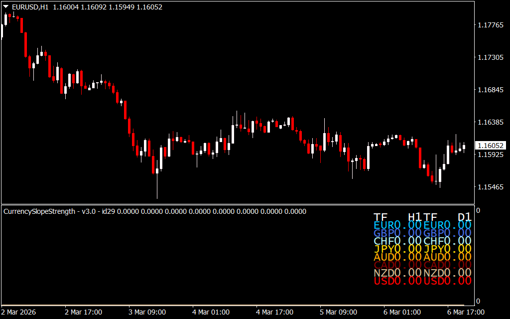 The Currency Slope Strength Indicator for MetaTrader 4 is a custom forex tool designed to measure and compare the relative strength of currencies. By analyzing slope angles and price movements, it helps traders identify strong and weak currencies to determine potential trend directions.