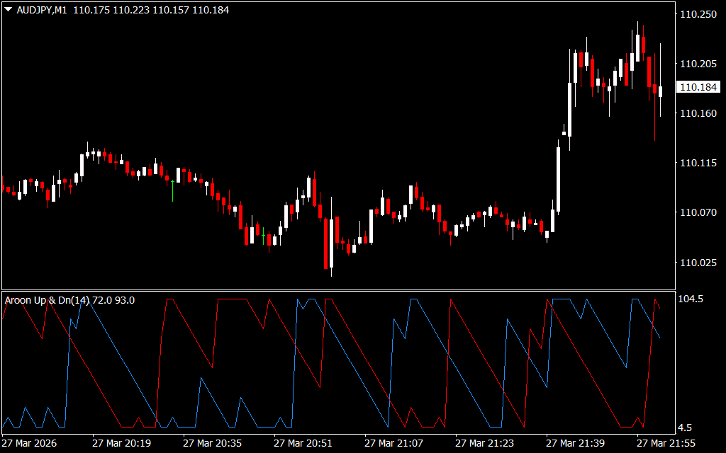 - Aroon Down (Red Line) – Measures bearish strength