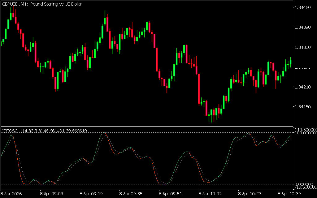 On the EUR/USD H1 timeframe, the DTOSC clearly shows bullish and bearish cycles through line crossovers, allowing traders to time entries and exits effectively.