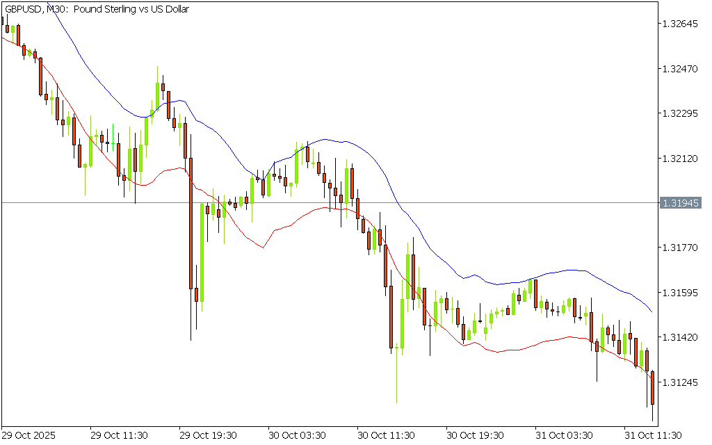 - Plots two color-coded lines (red and blue) on the price chart