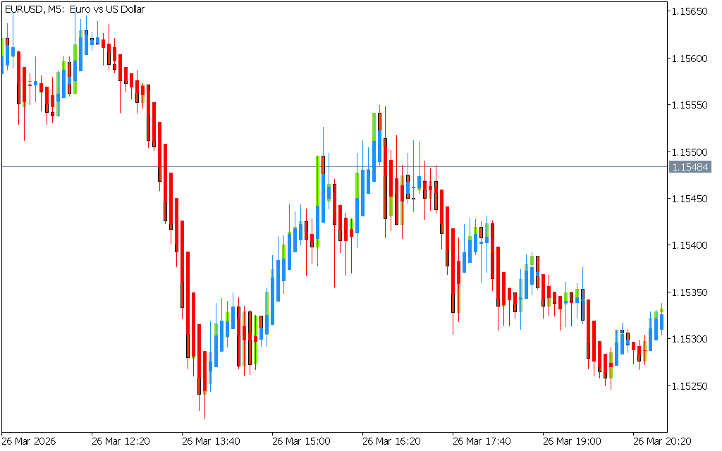 The indicator uses color and candle structure to signal market conditions: