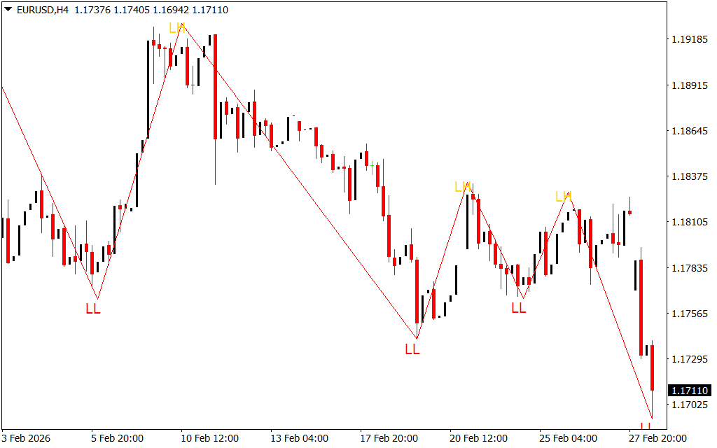 - Buy trade: Enter when the Zigzag plots a lower low (LL). Place a stop-loss below the previous swing low.