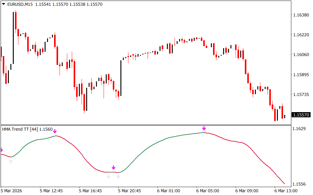 These arrows appear when the indicator detects a potential entry opportunity based on HMA trend analysis.