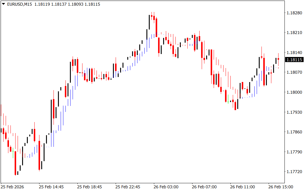 The indicator plots color-coded bars on the price chart for clear trend visualization: