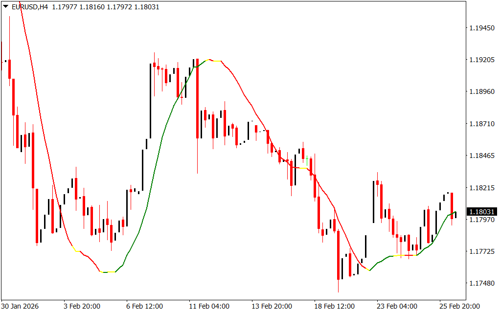 - Hold the trade until an opposite signal appears or the line turns yellow.