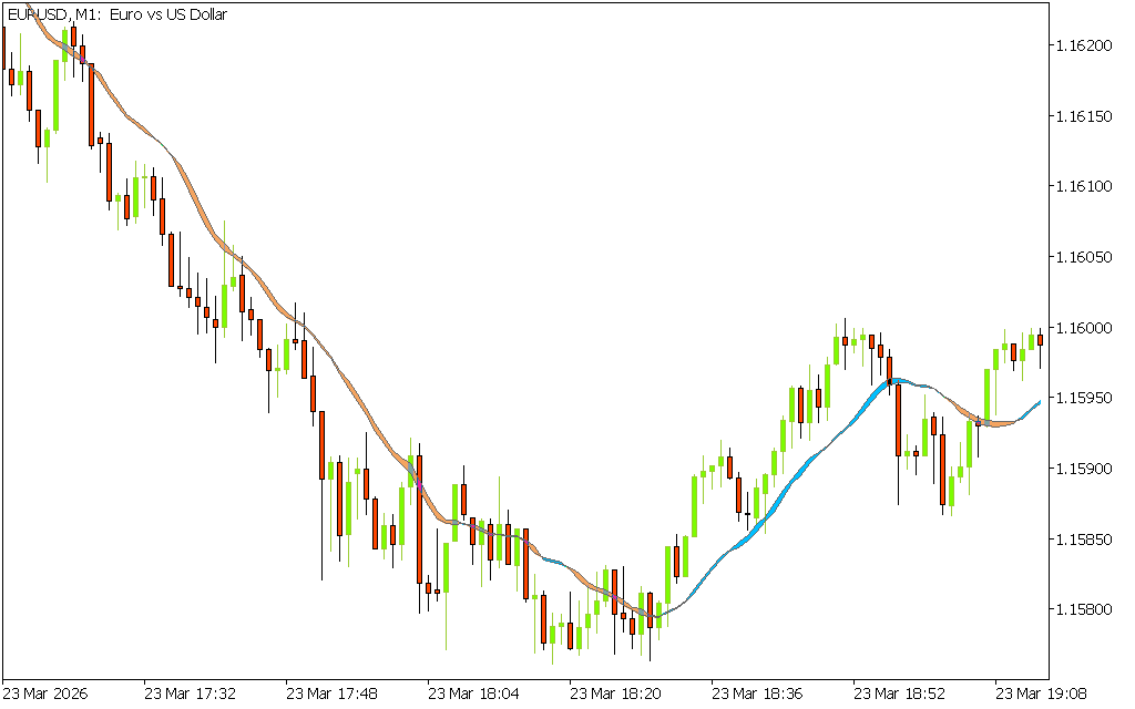 - Ribbon Visualization: The indicator fills zones with orange and blue colors to signal selling and buying opportunities, respectively.