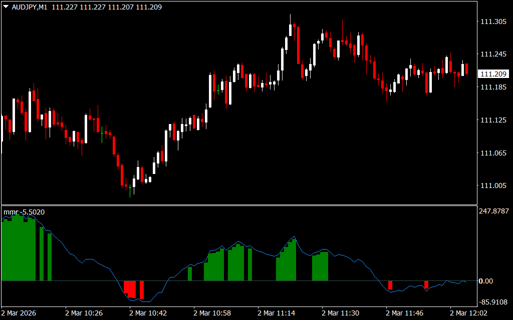 The MMR Indicator uses a histogram and color-coded candles to display trend direction:
