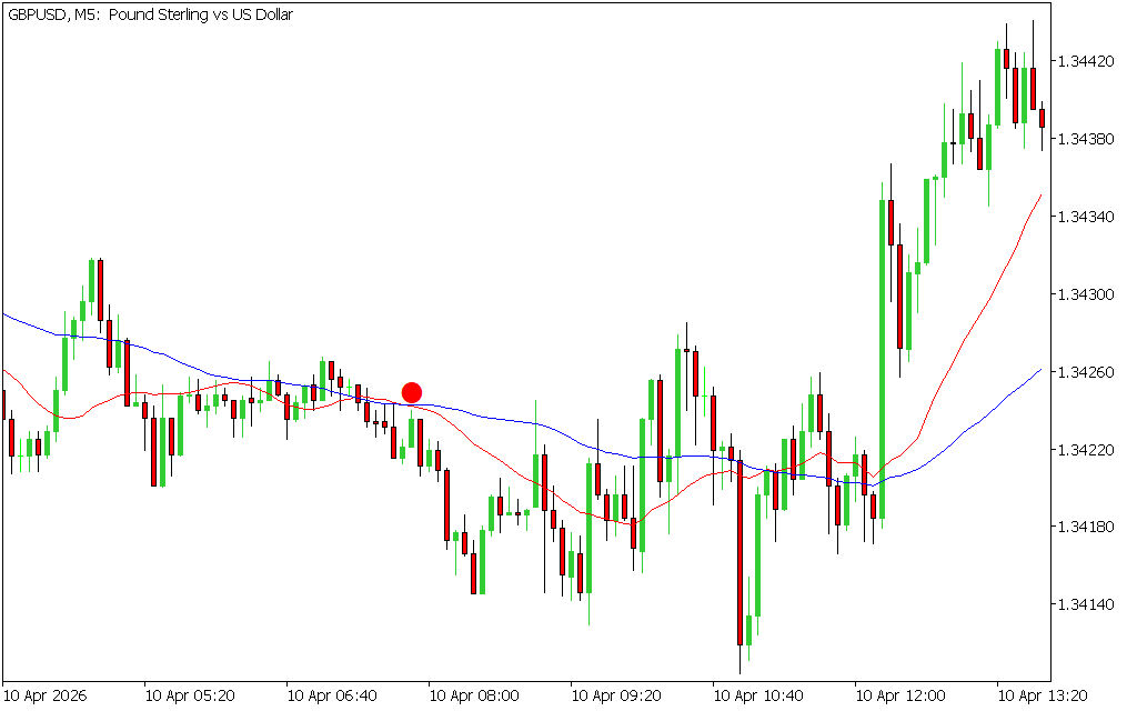 On the GBP/USD chart, a sell signal appears when the red line crosses below the blue line and a red circle is drawn. Later, the market reverses, and a buy signal is generated when the red line crosses above the blue line, confirming a new uptrend.