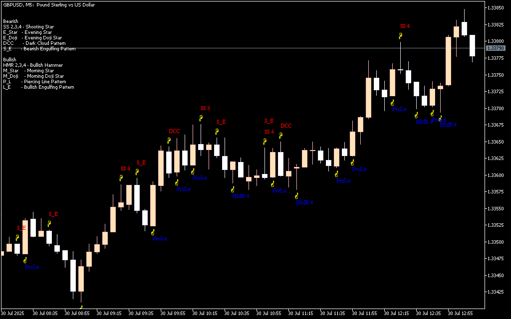 The indicator identifies various candlestick patterns as they form and places short labels on the chart for easy recognition. For example: