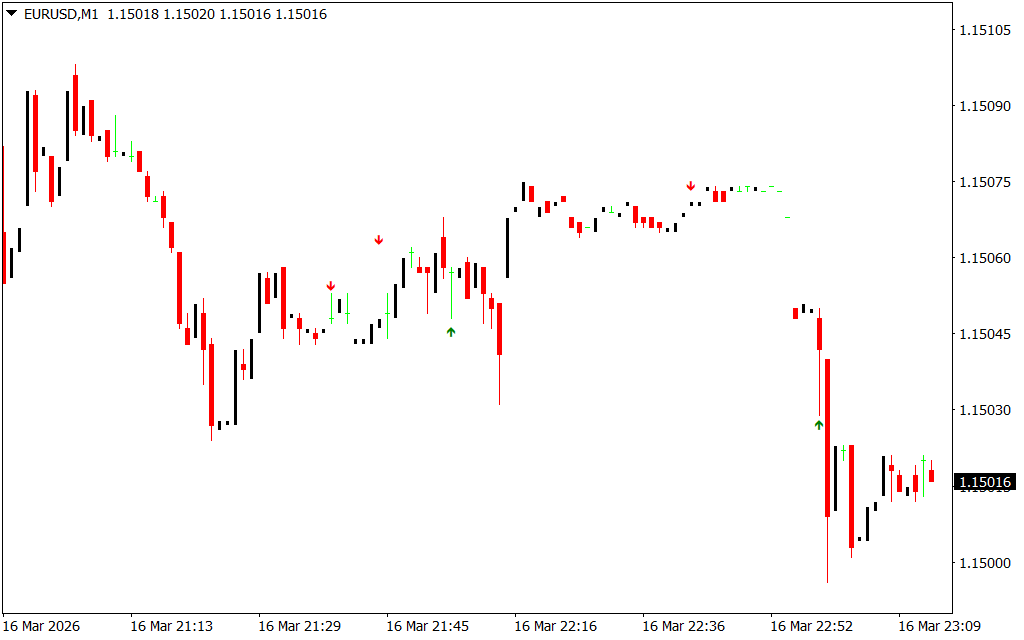 The Pin Bar MT4 Indicator scans the chart automatically and identifies pin bar formations. When a pin bar is detected, the indicator marks it with visual arrows: