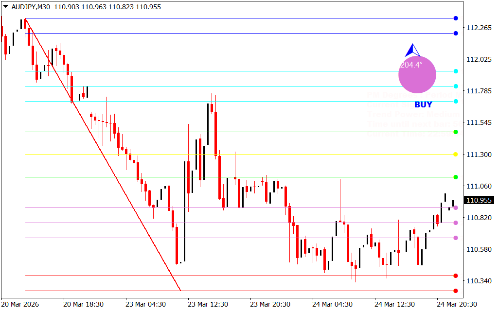 - Visual Guidance: Plots colored lines to indicate different angles of price movement, including a red line for the current price wave.