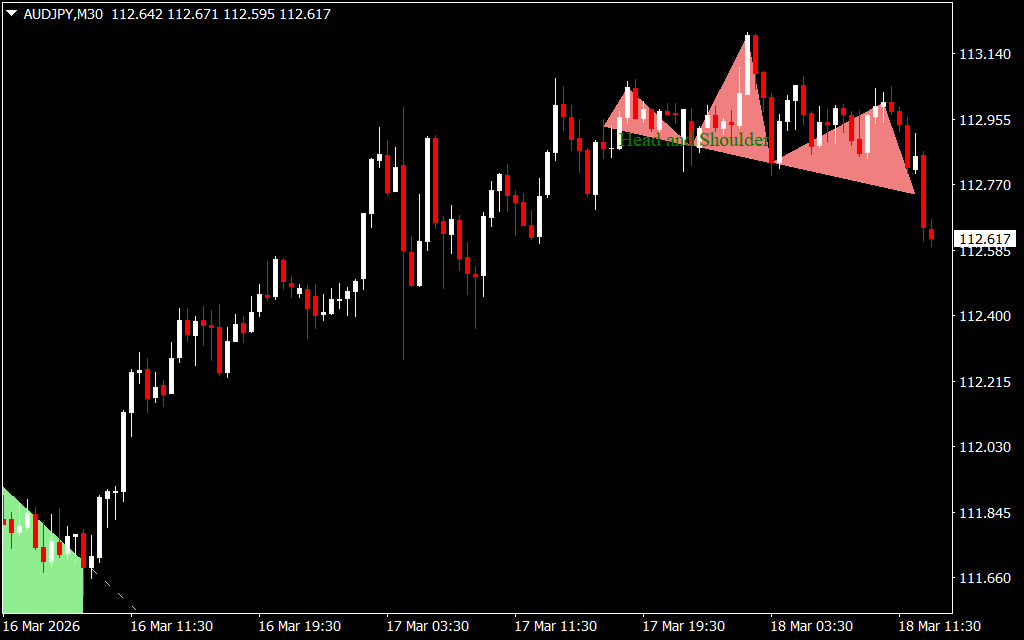 Later, the chart develops a head-and-shoulders pattern, highlighted by a light coral shaded area. This pattern typically indicates a potential shift from a bullish market to a bearish one. When this occurs, sellers may begin to dominate the market.