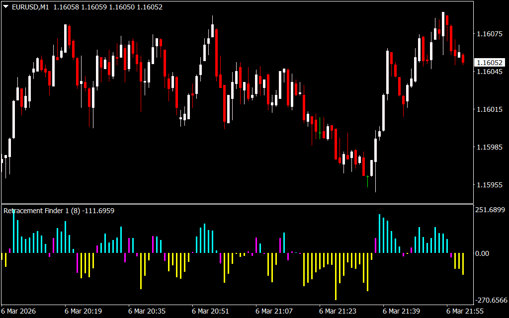 The Retracement Finder Indicator for MT4 is a simple technical tool designed to help traders identify market retracements and potential trend reversals. A retracement occurs when price temporarily moves against the main trend after a strong upward or downward move.