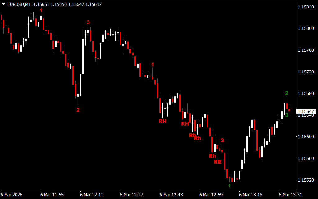 The Ross Hook Trading Pattern Indicator automatically scans the chart and identifies the 1-2-3 pattern formation. Once the price breaks the Point-2 level, the indicator prints a signal labeled “Rh” on the chart.