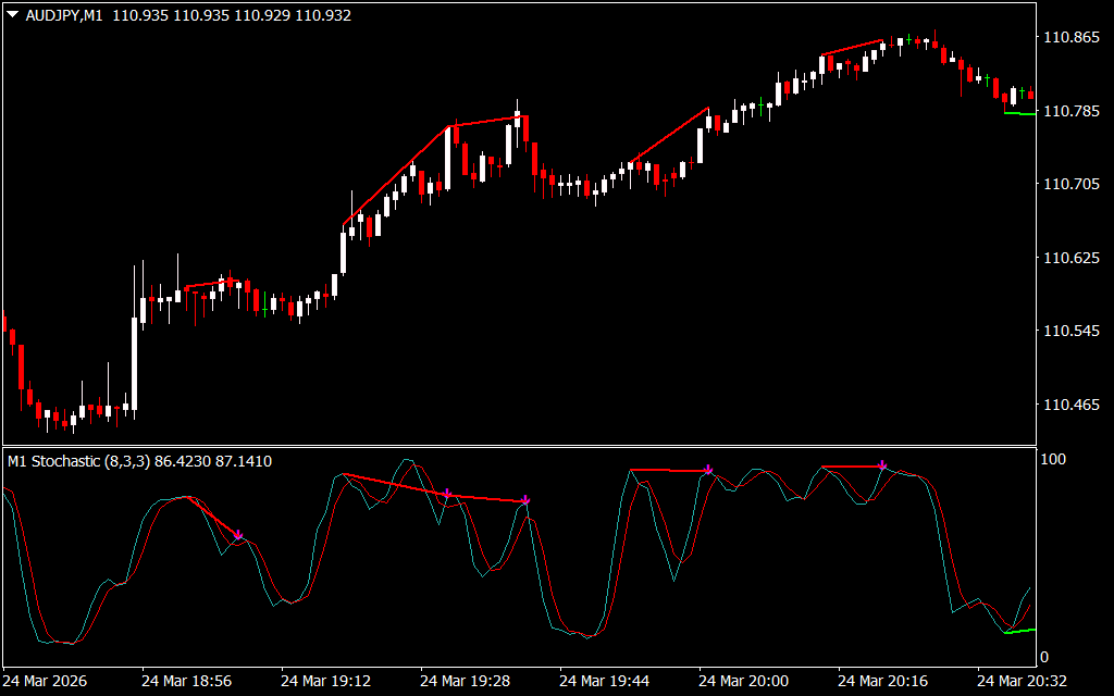 - Visual trend lines plotted on both price chart and stochastic indicator window
