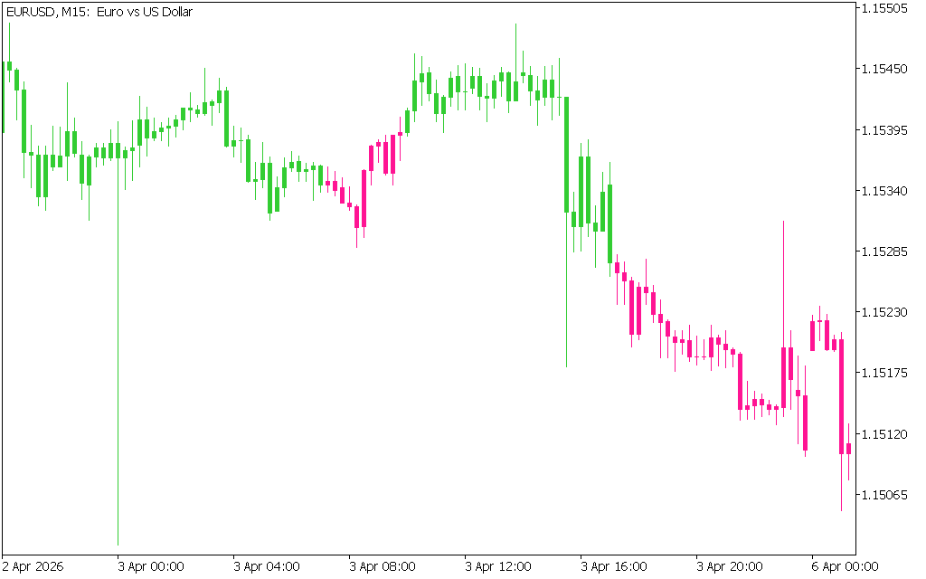 - Candle Color Signals: Green for bullish, pink for bearish.