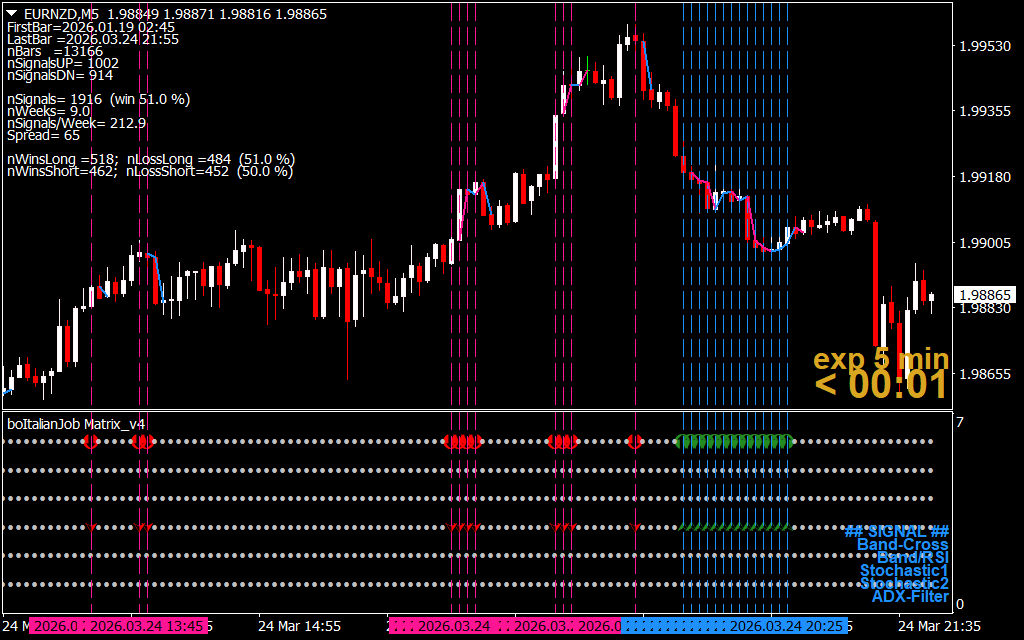 The Italian Job Matrix V4 is a composite indicator that integrates four different technical tools into a single interface. These indicators work together to confirm trading opportunities, reducing false signals and improving overall accuracy.