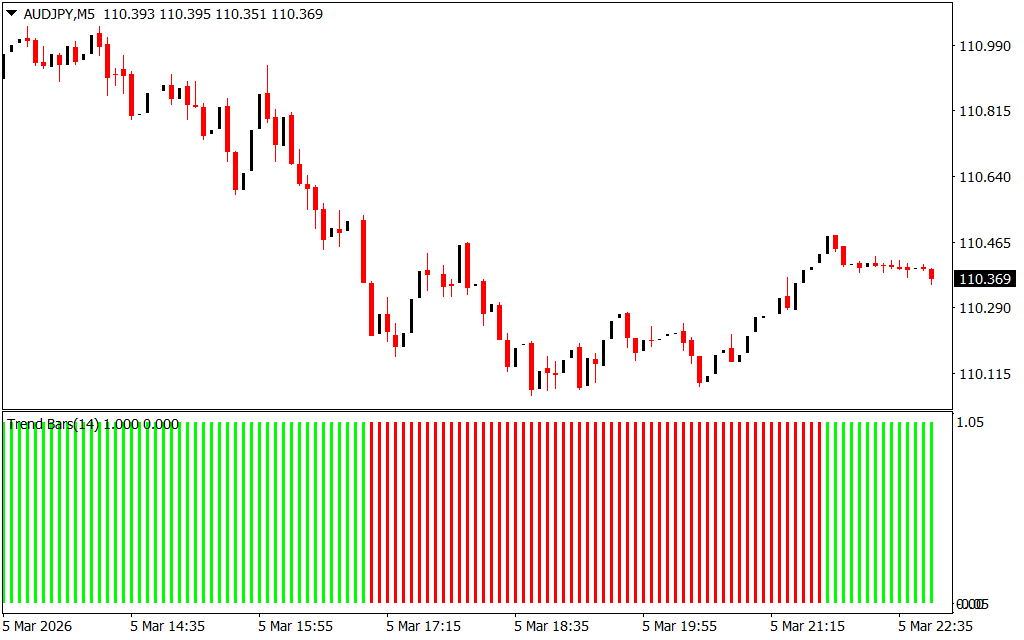 The Trend Bars indicator performs best in strong trending markets. In sideways market conditions, price may frequently switch direction, causing the indicator to change colors often. Therefore, combining the indicator with support/resistance analysis or additional technical indicators can help improve trade accuracy.