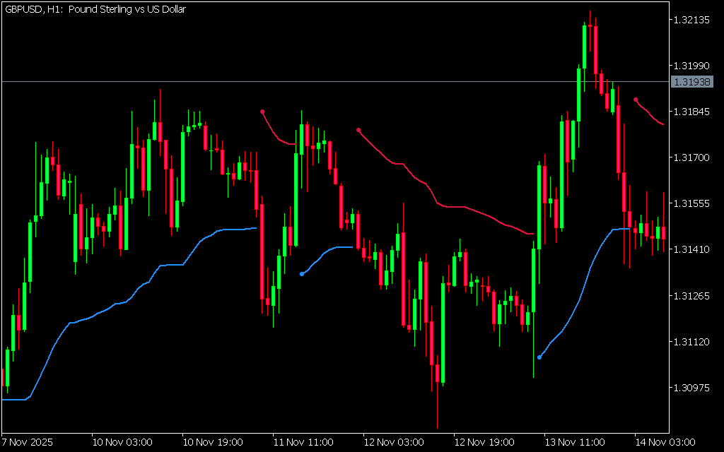 The indicator draws two colored lines on the price chart: