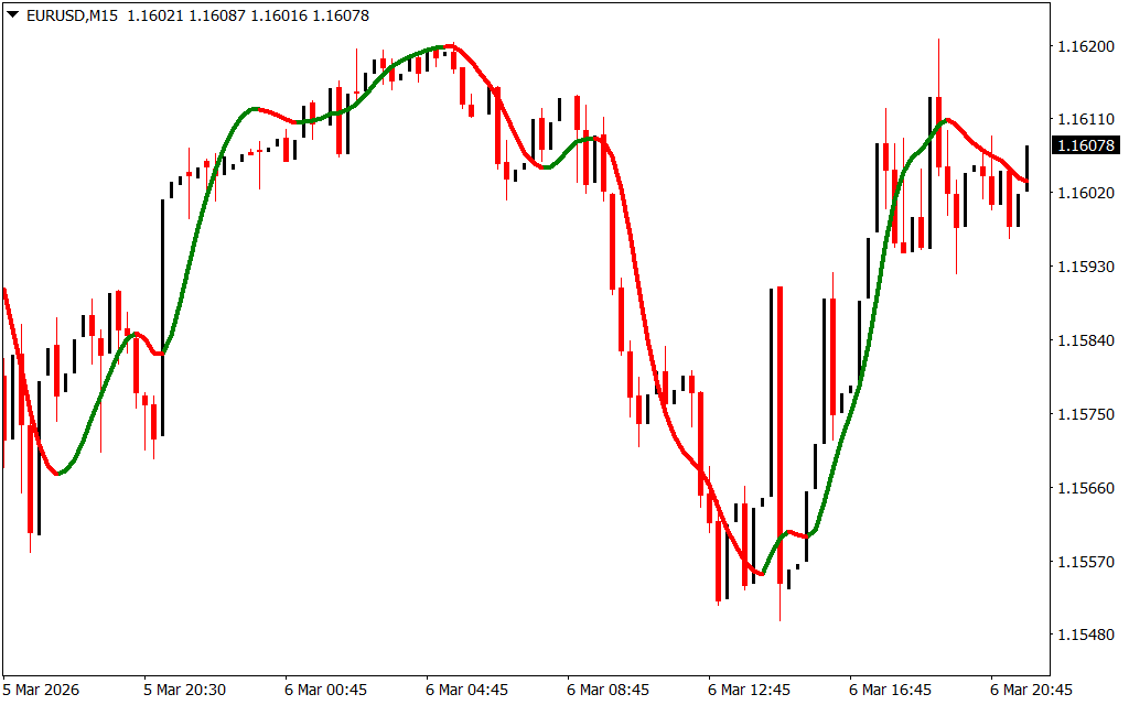 Because of its smooth calculations, the indicator acts similarly to a dynamic trend line or moving average, but with faster response to price changes.