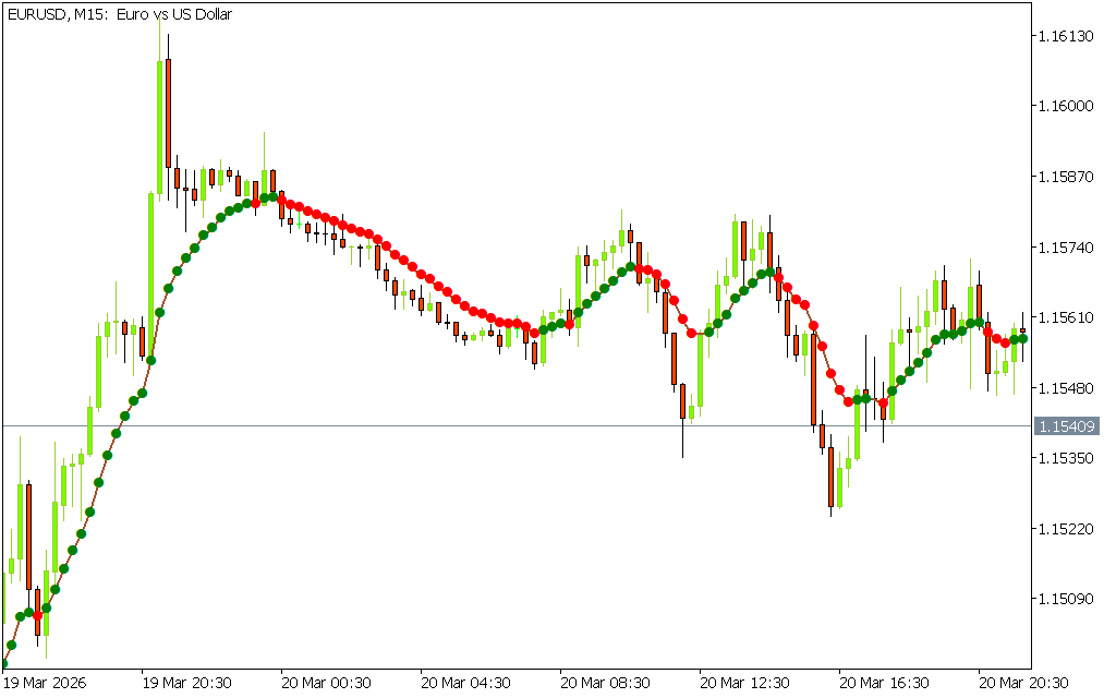 - Bullish & Bearish Signals: Uses red and green dots on the chart to indicate bearish and bullish trends, respectively.