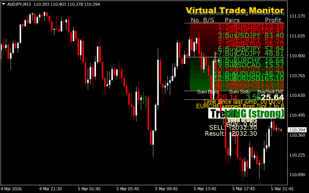 The Virtual Trade Monitor Indicator for MT4 is a multi-pair monitoring tool that displays BUY and SELL signals for selected forex pairs in a convenient dashboard. Instead of switching between multiple charts, traders can quickly view market signals and trend strength from a single interface.